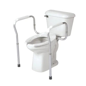 Toilet safety frame is constructed of anodize, noncorrosive aluminum tubing and comes with brackets to easily attach the frame to the toilet. Contoured waterfall armrests with gripping surface provide additional comfort and support.